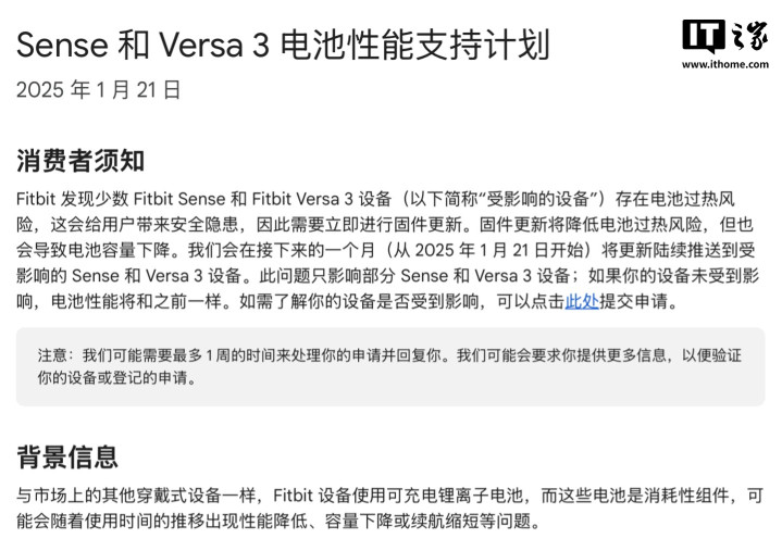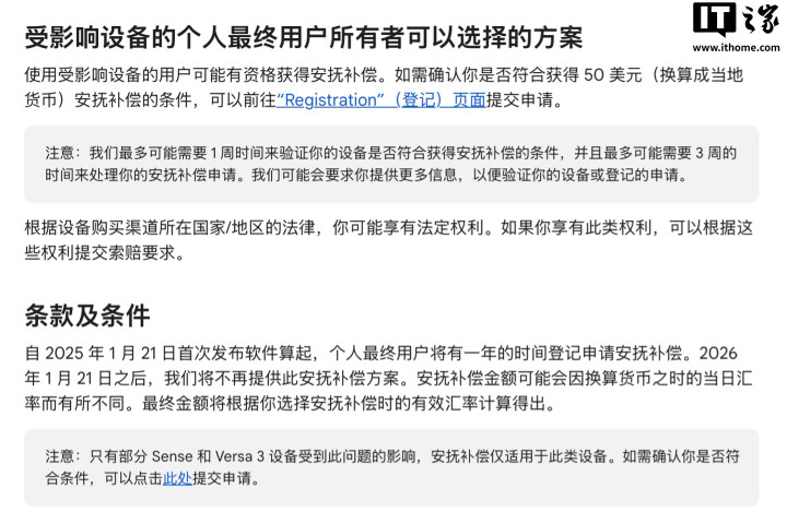 作为补偿,谷歌表示FitbitSense或FitbitVersa3的所有者可以访问特定网站领取价值50美元(IT之家备注:当前约364元人民币)的补偿(补偿计划2026年1月21日结束),若购买了相关手表的海外家友们可以(点此访问)领取。